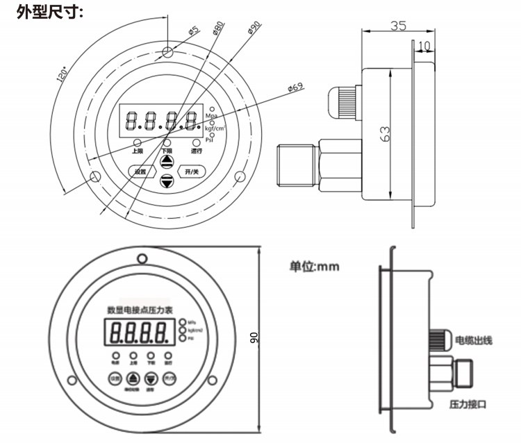 输出形式 | 继电器输出,(高报警、低报警、公共线)接线方法同电接点压力表 |